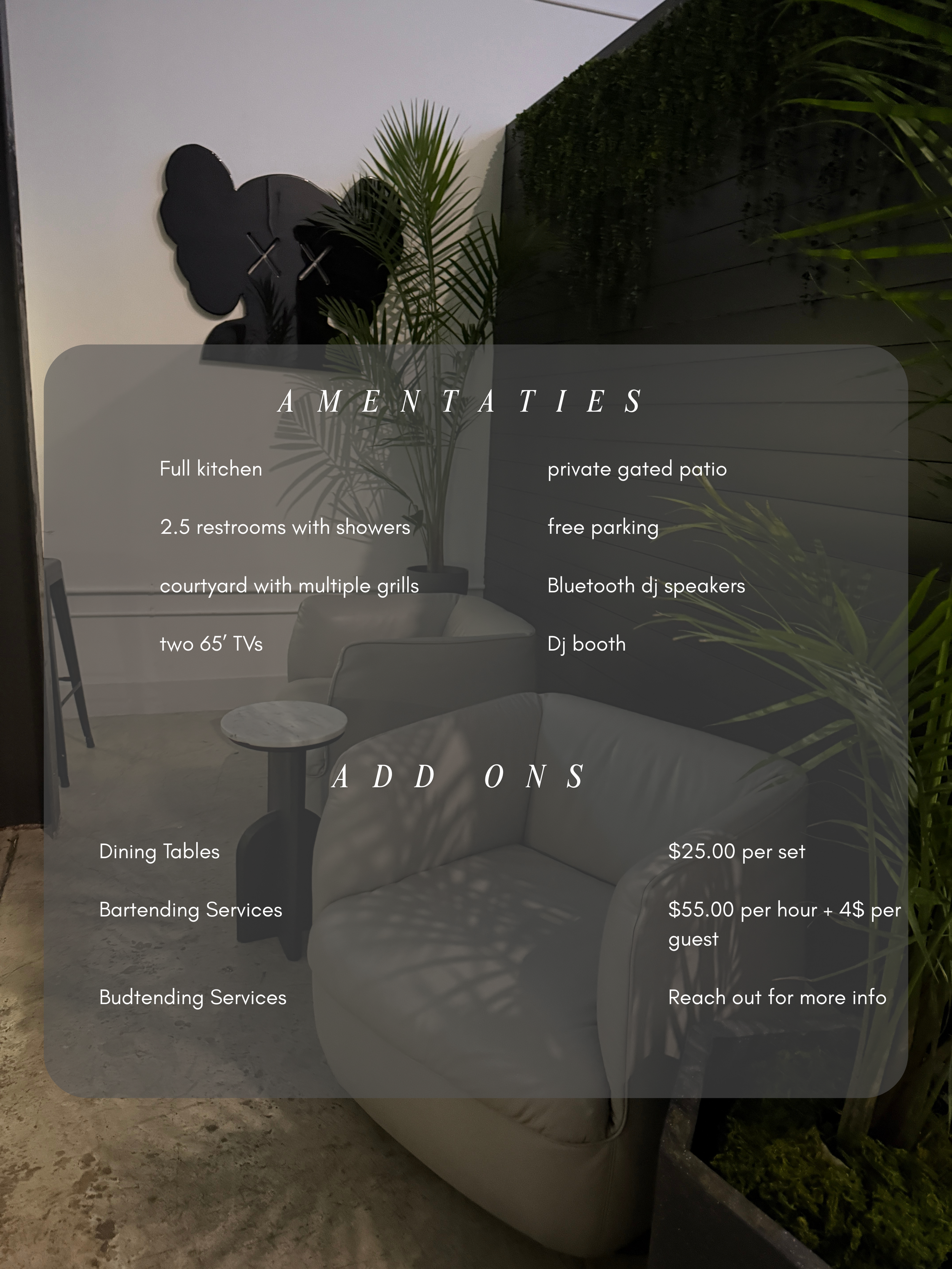 Hourly rates are available for events, productions, and private experiences.